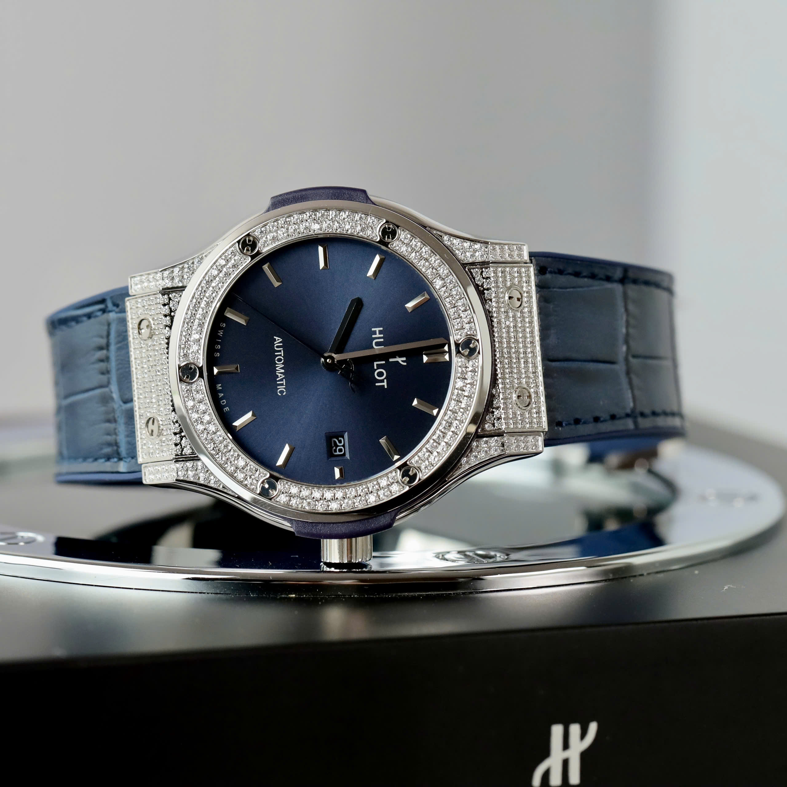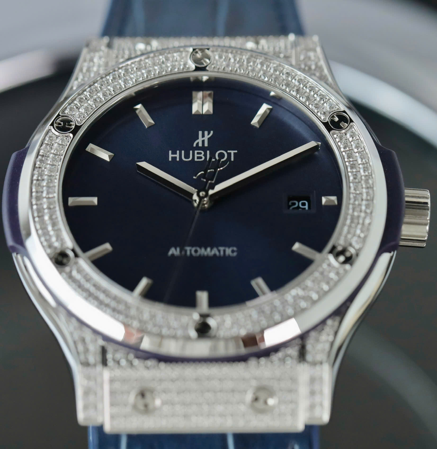 Hublot Knock Off Watches Classic Fusion Titanium Blue Dial Full Diamonds CZ 42mm